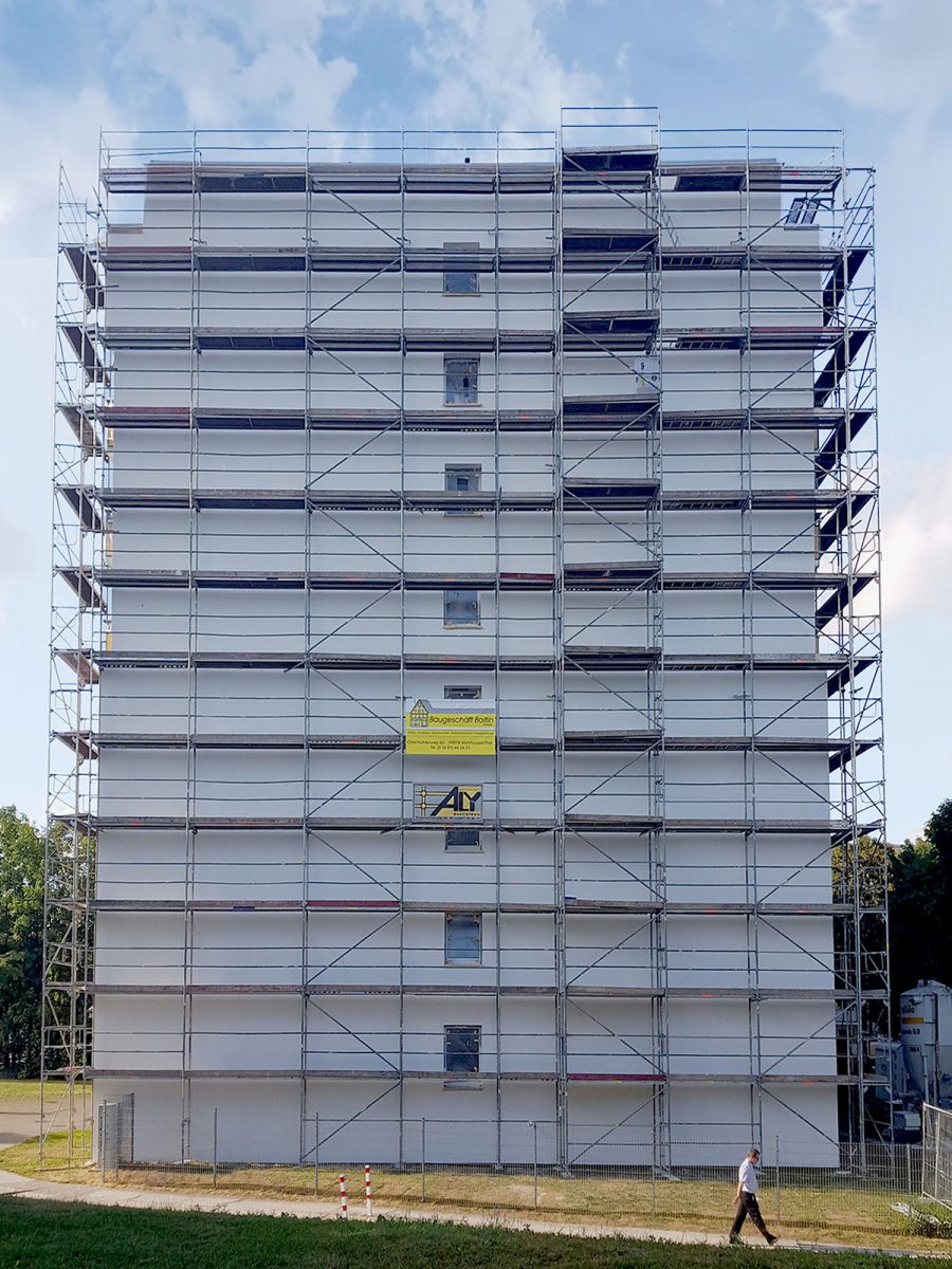 Einrüsten der Fassade sowie Vorbehandlung und Grundierung.