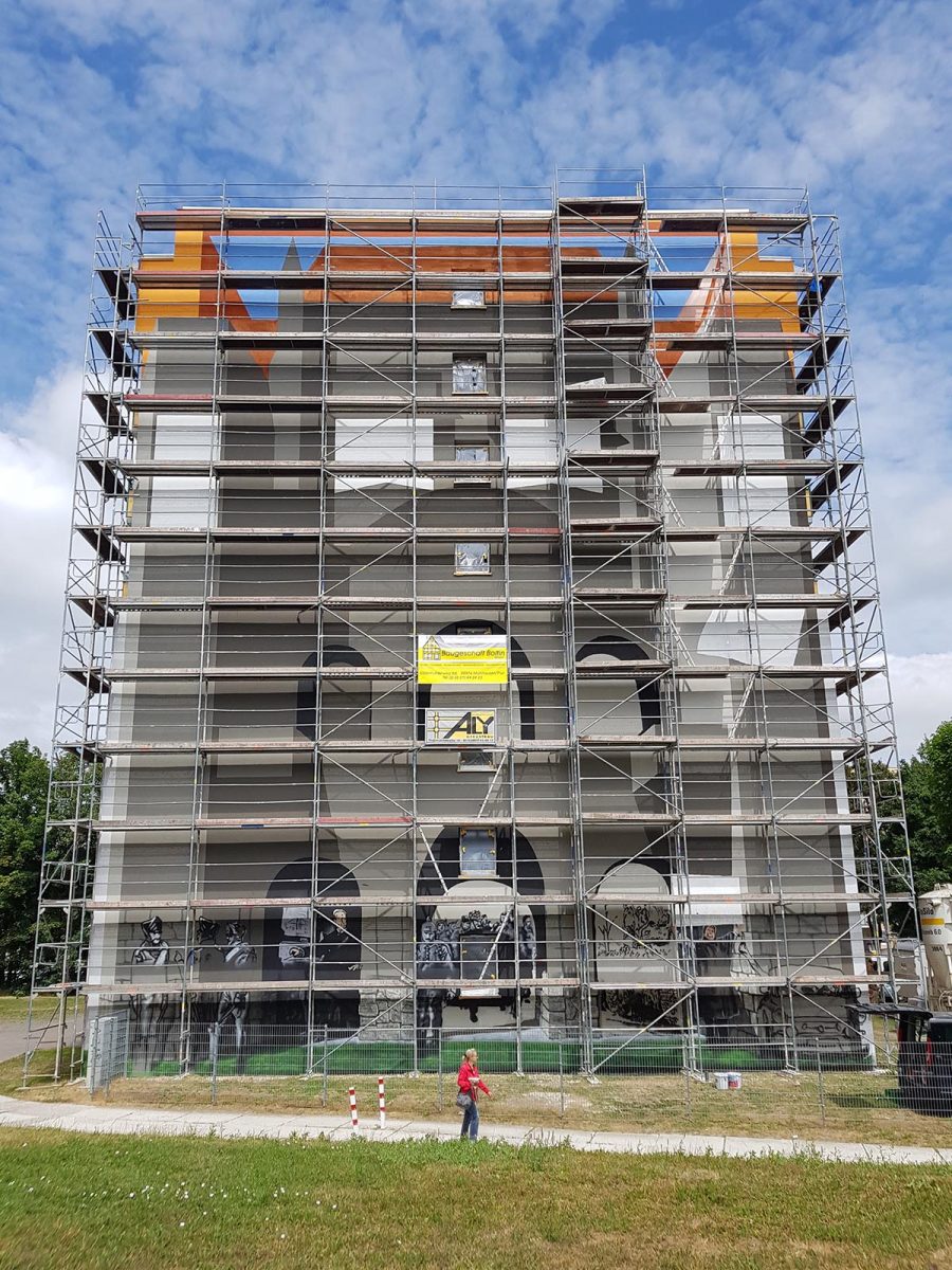 Der obere Teil des Kunstwerkes ist bereits fertig und abgerüstet, während unten noch gearbeitet wird.